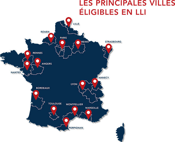 | Zone A | Agglomération de Paris (dont la zone Abis), la Côte d’Azur, la partie française de l’agglomération genevoise, certaines agglomérations ou communes (ex. : Lille, Strasbourg, Lyon, Marseille, Montpellier, Toulouse, Bordeaux, Nantes et Rennes) et 10 communes des départements d’outre-mer où les loyers et les prix des logements sont très élevés. |